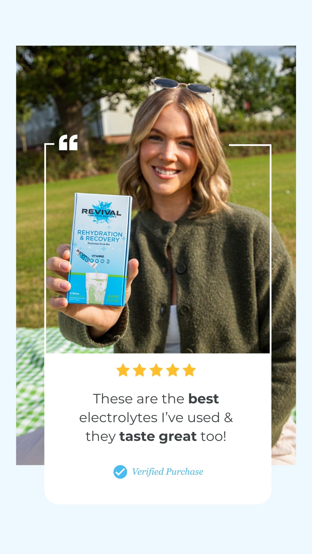 Revival is based on a World Health Organisation (WHO) formula and has been designed to provide rapid rehydration whilst delivering a strong dose of vitamins. Our precise blend has been developed alongside leading scientists, doctors and nutritionists and is engineered for optimal hydration